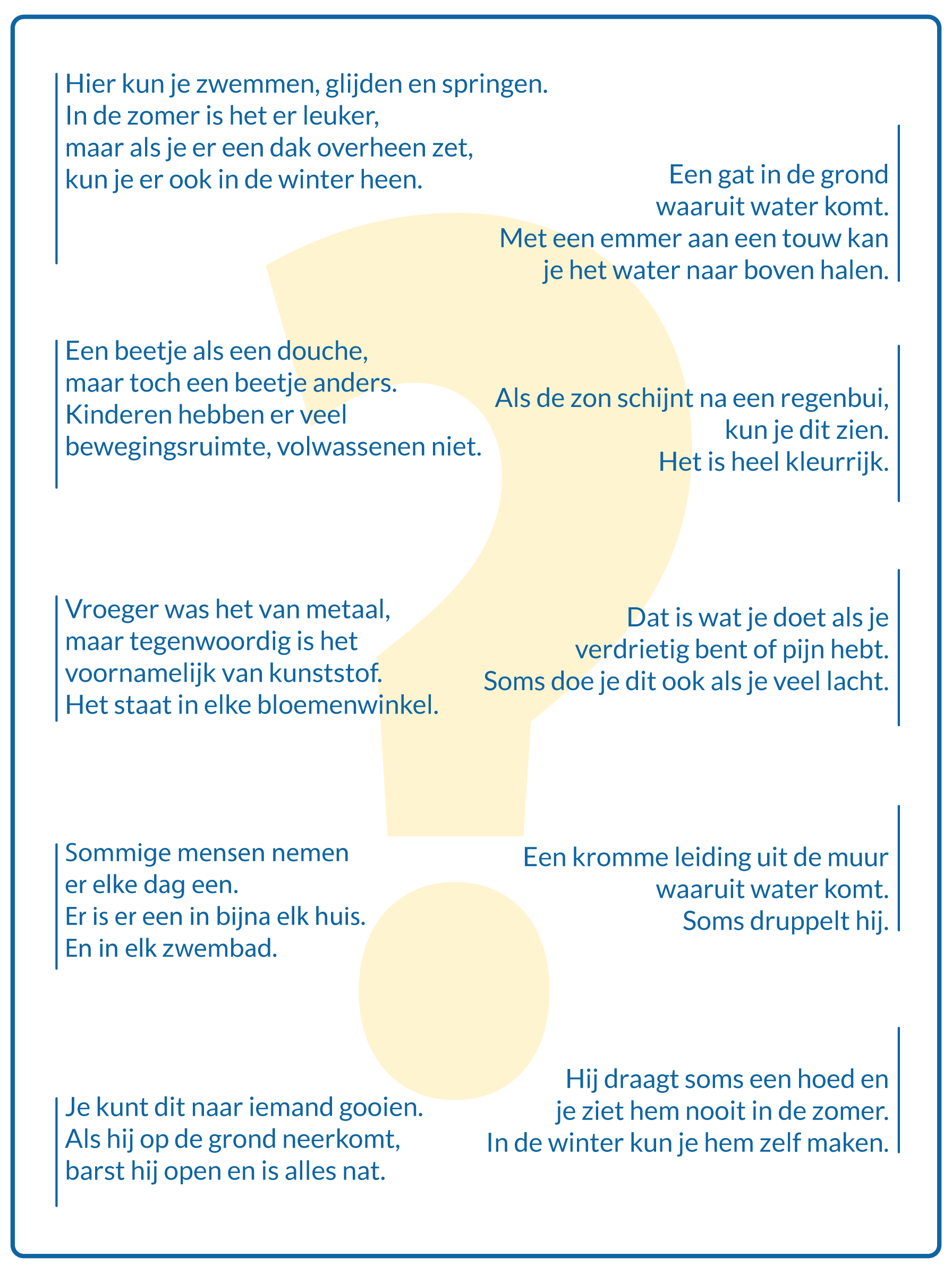 Bij ons "Dingsda-spel" leggen kinderen begrippen rond het thema water uit, zonder de term water te noemen. Soms grappig en niet altijd gemakkelijk te raden. Heb je zin om (mee) te raden?